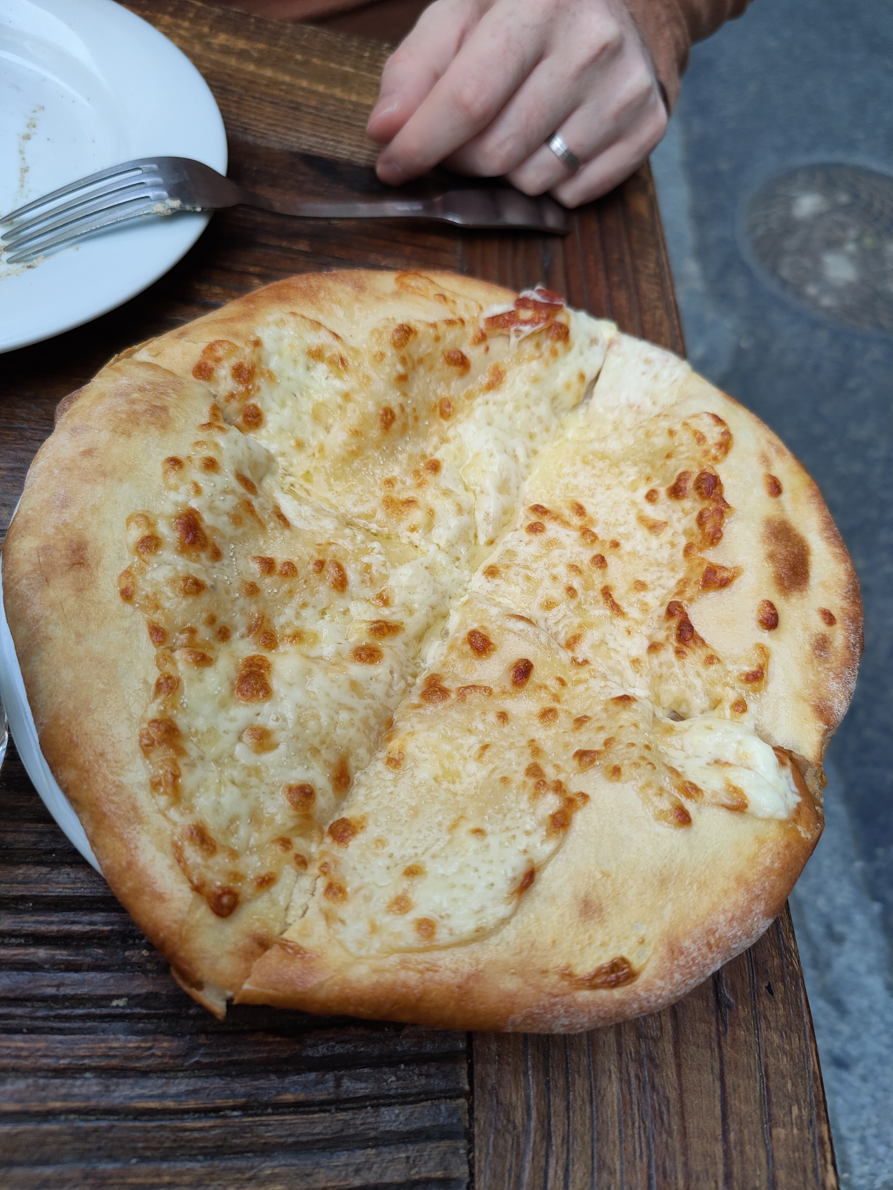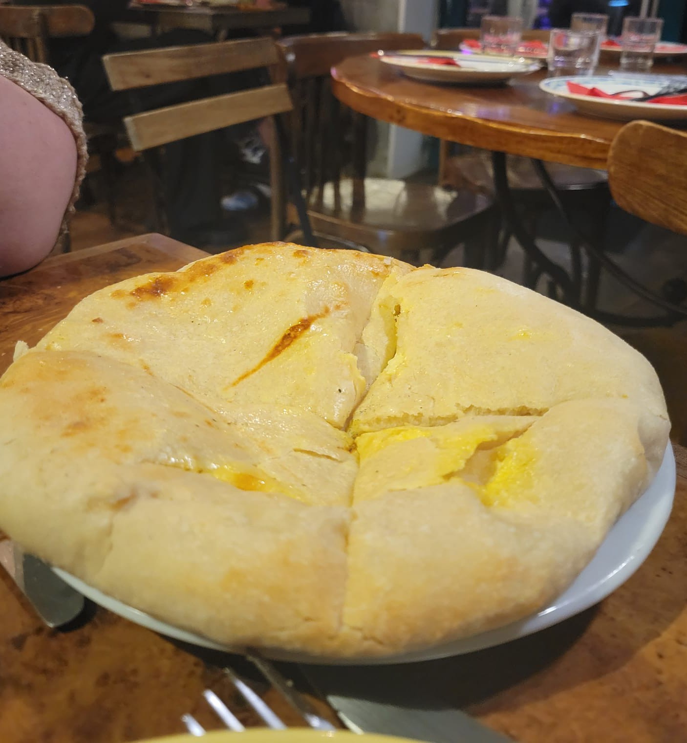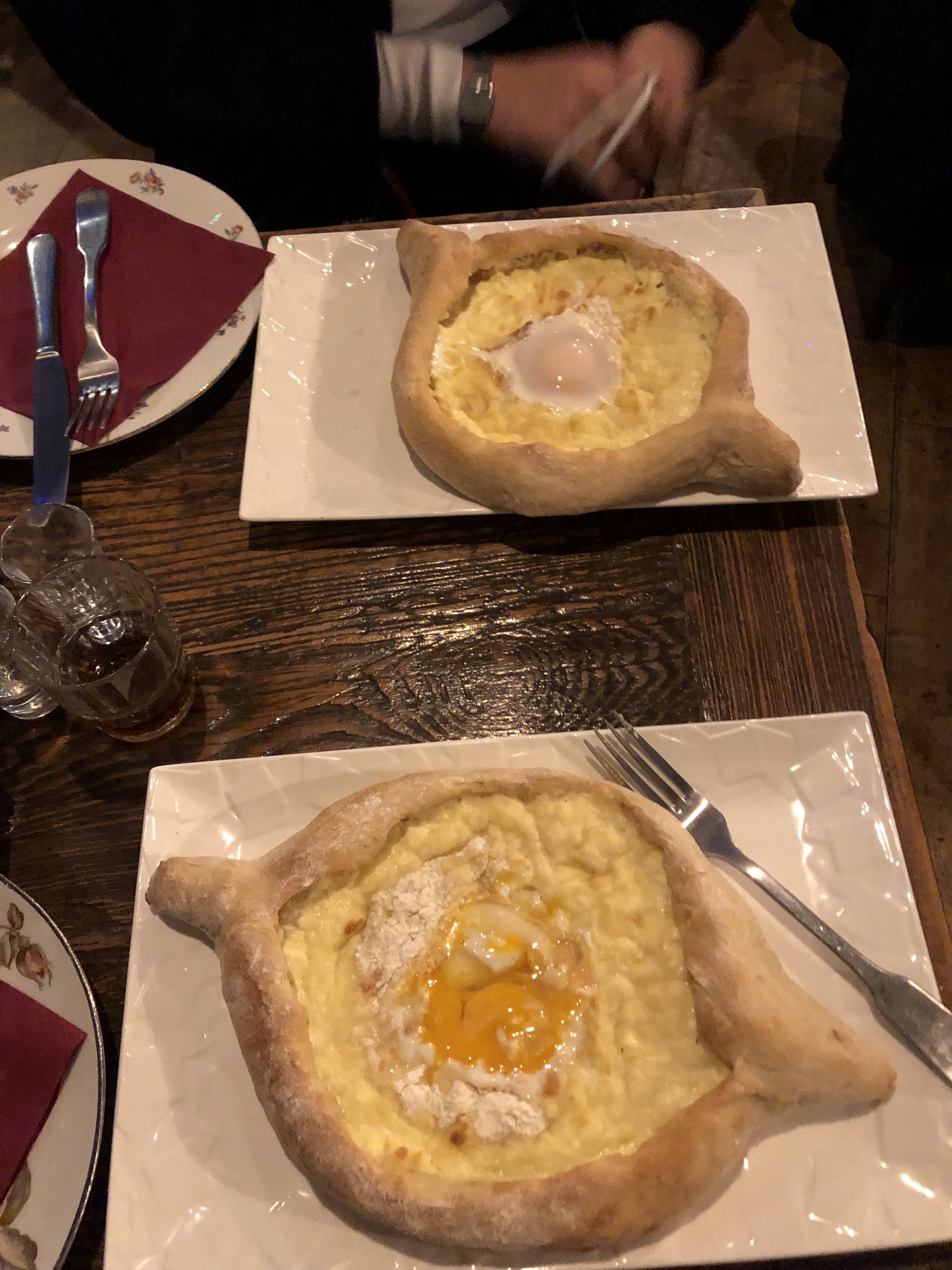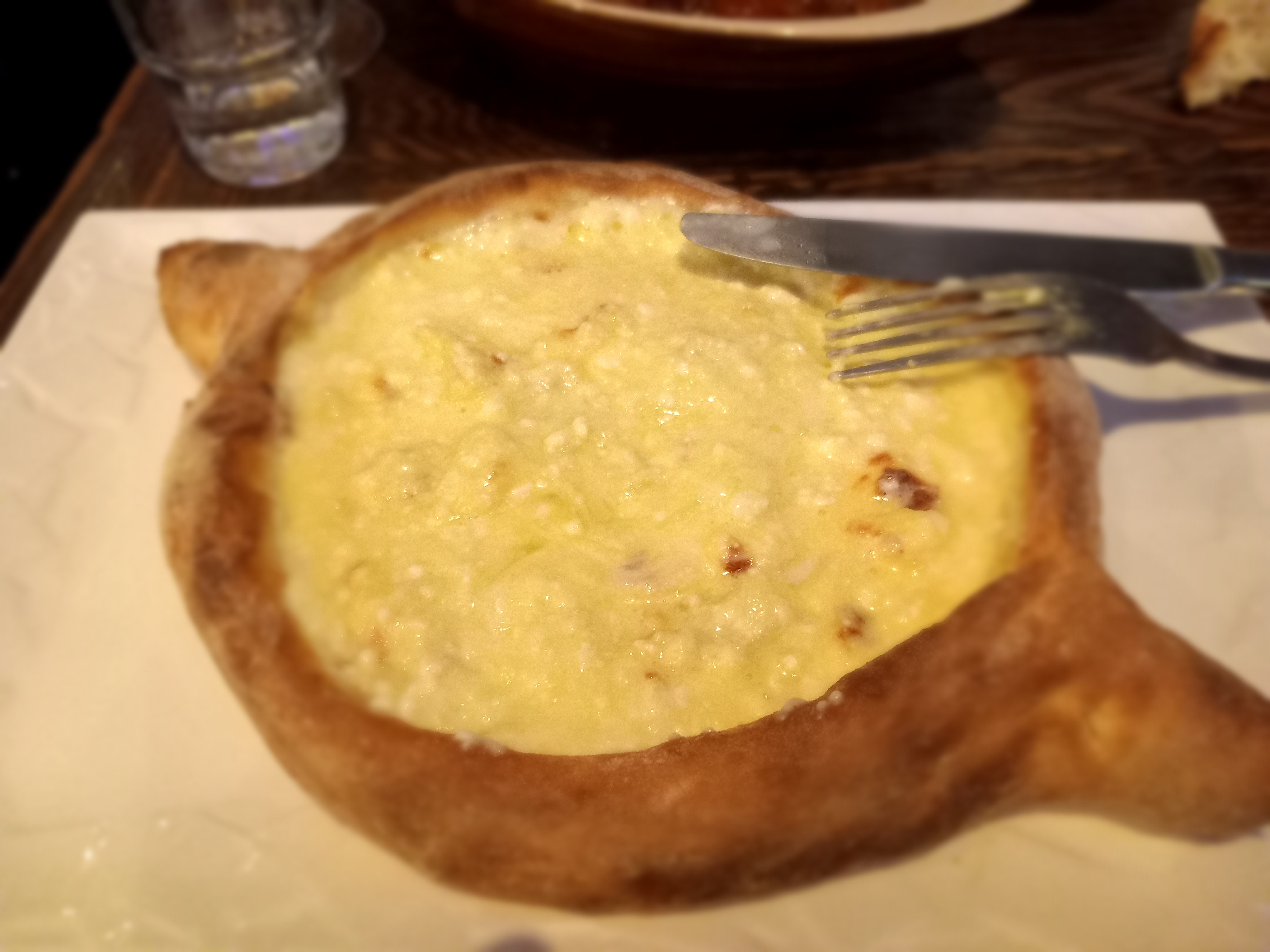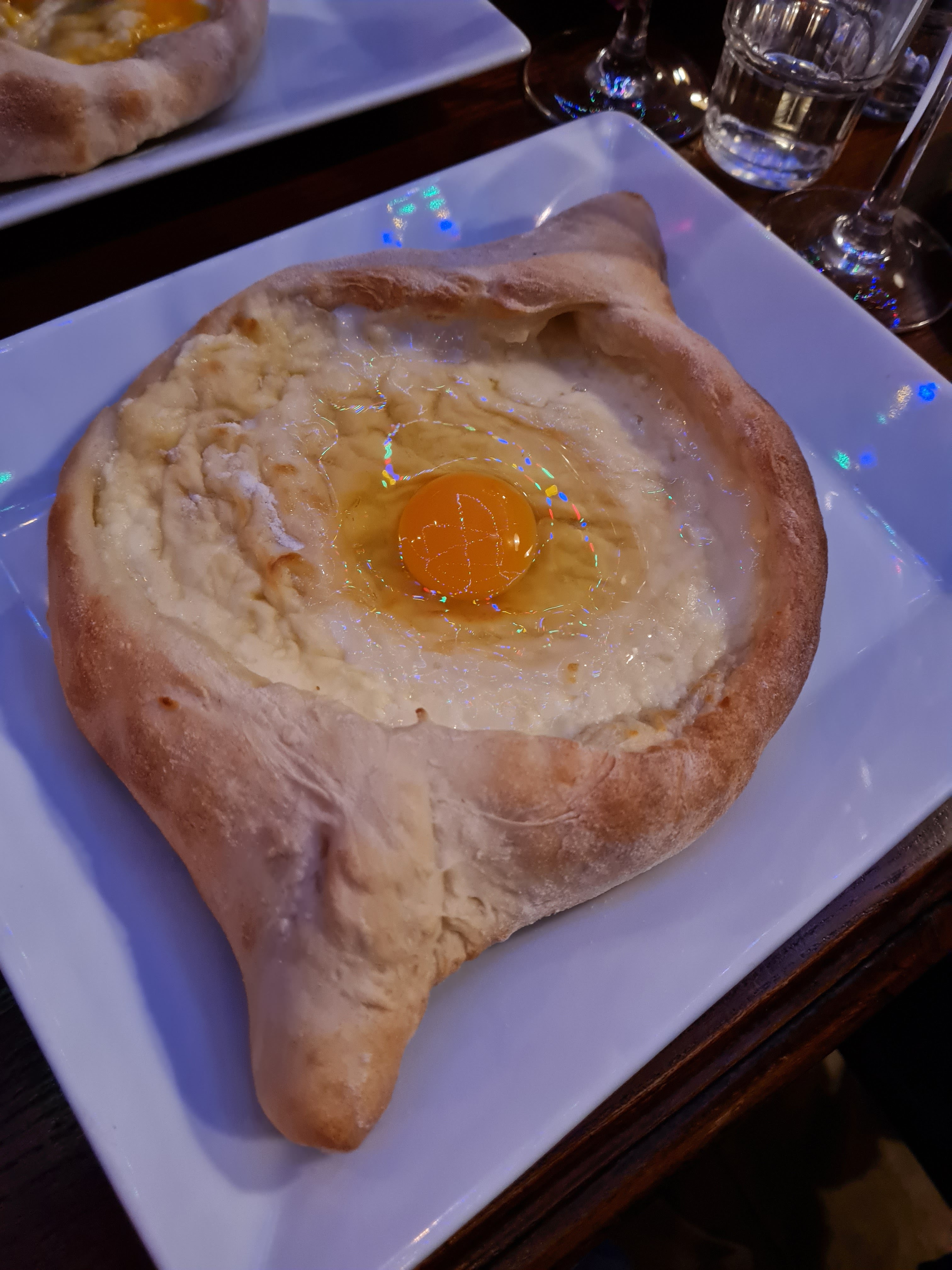 Accueil sympathique dans ce restaurant géorgien mais nous en sortons un peu déçus. Les plats - certainement maisons et avec des produits frais - manquent cependant de saveurs. Le pain au fromage est bon mais n’a rien d’extraordinaire alors que le vin gagnerait à être servi plus frais pour être dégusté à sa juste valeur (les géorgiens en produisent bien depuis des millénaires!).