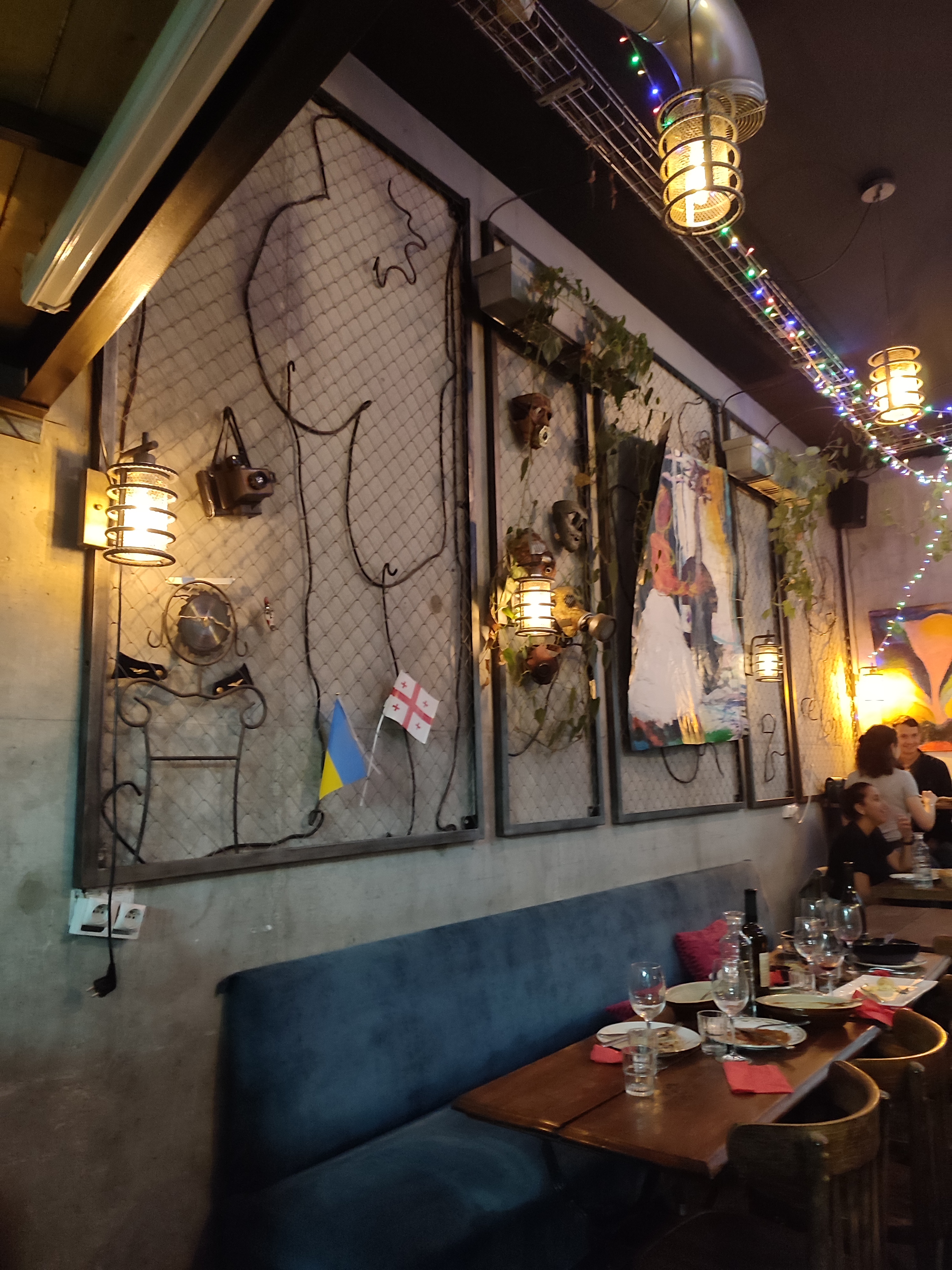 Ambiance particulière. Le faible éclairage donne à penser que le restaurant est fermé … mais c’est une cuisine savoureuse qui est servie. A faire entre amis pour partager les plats et laisser tenter par une bouteille de vin géorgien