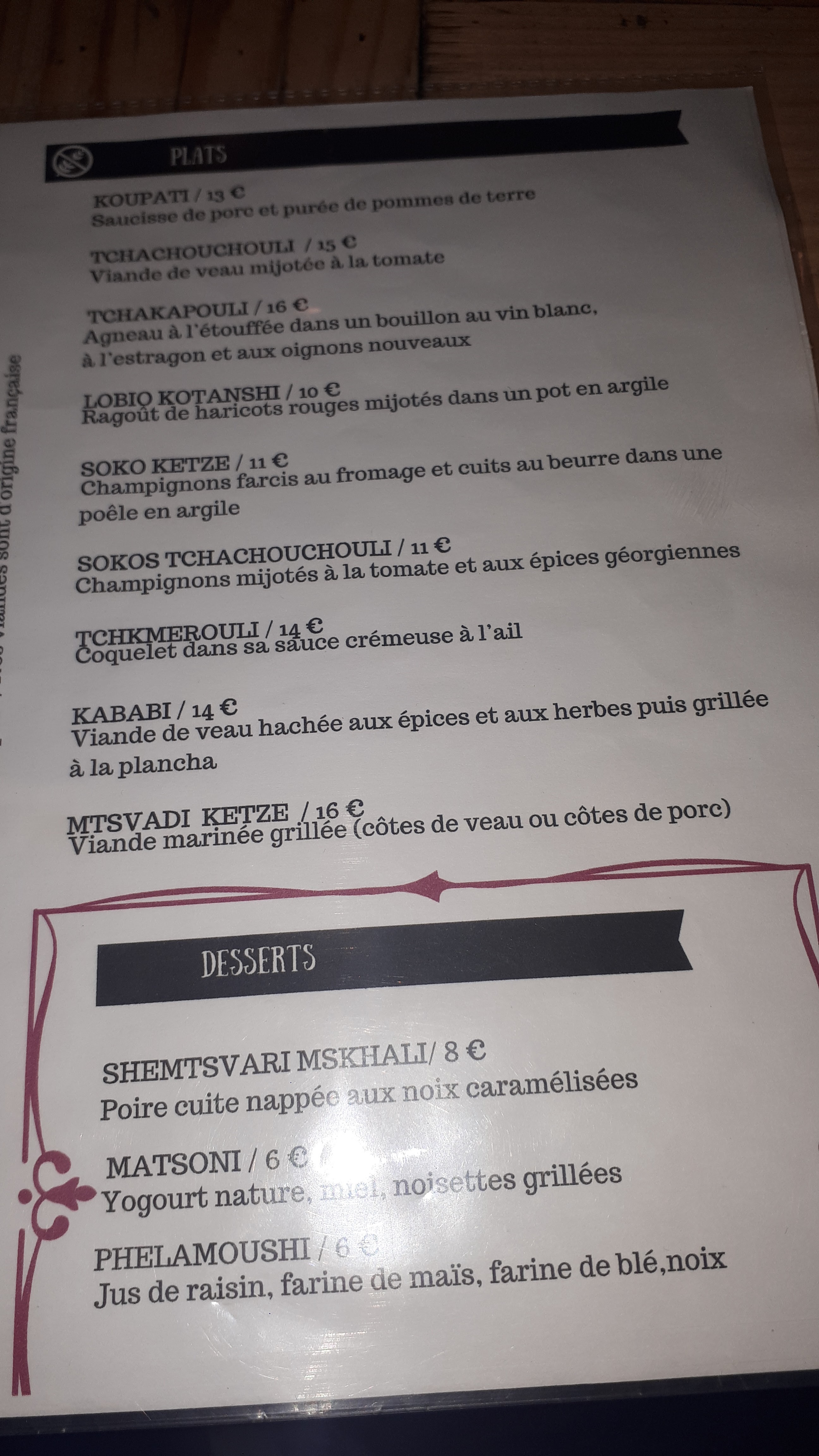 Très bon restaurant géorgien! J'ai passé des vacances en Géorgie il y a quelques années et j'y avais adoré leur cuisine. Ce restaurant m'a permis de retrouver toutes les saveurs que j'avais découvertes là-bas. Le cadre et l'ambiance sont très chaleureux. Je ne mets pas 5 étoiles car ils ne proposent pas de Khimkalis qui est un incontournable de la cuisine géorgienne et qui est surtout un plat succulent.